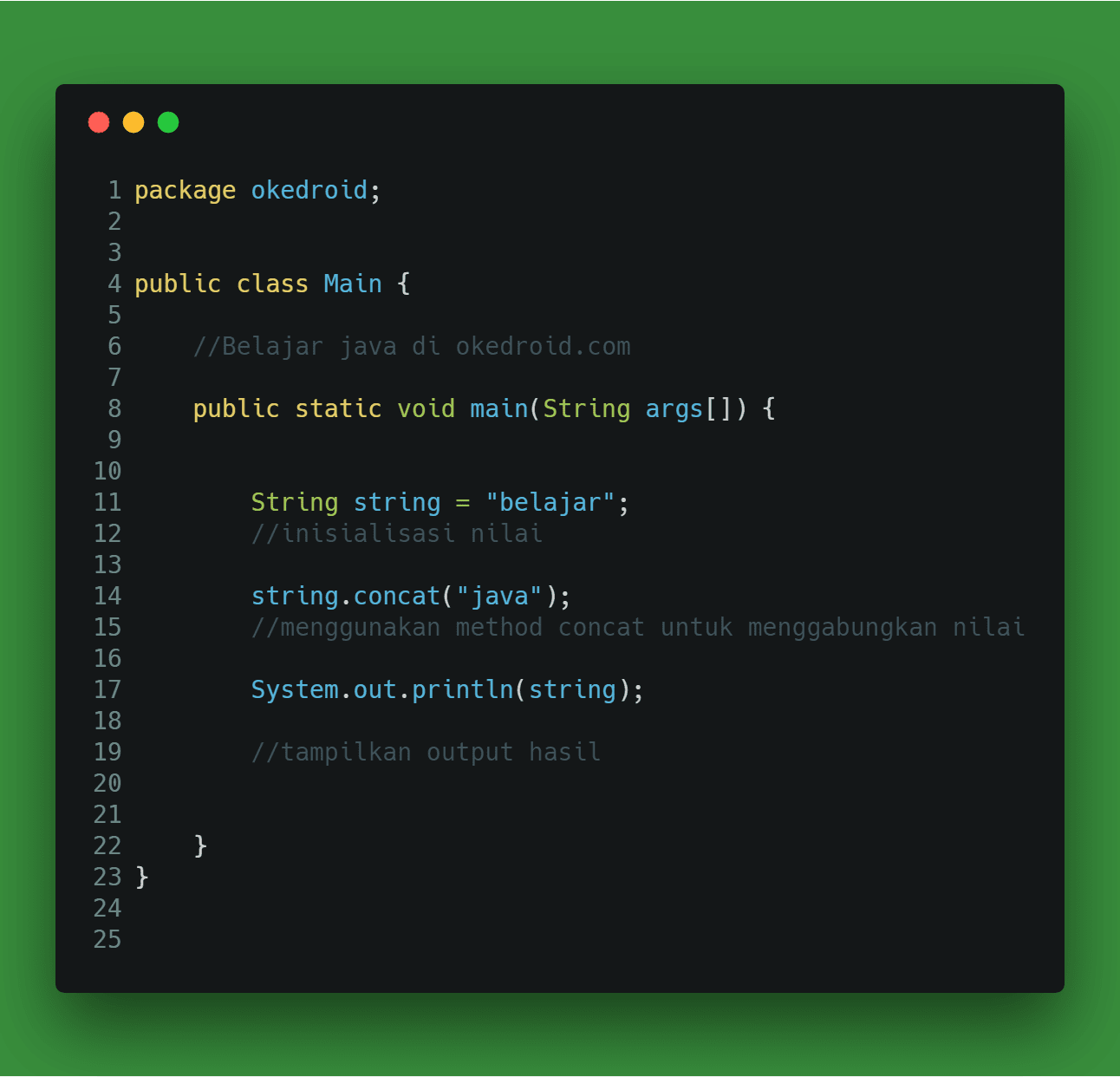 Seperti yang kalian lihat , khususnya pada baris code ( string = string.concat("java"), kita telah menetapkan kembali secara eksplisit , sehingga tampilan output yang dihasilkan yakni : "belajarjava". Makara method .concat() ( concatenate = merangkai ) disini bukan mengubah , tapi hanya menggabungkan , nilai string yang sifatnya tetap alias immutable, menjadi output hasil baru. Sama saja seperti code (string = "belajar "+ "java").